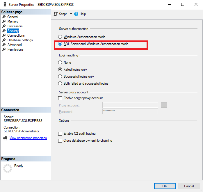 C:\Users\Administrator>net start C:\Users\Administrator>net stop "SQL Server (SQLEXPRESS)" The SQL Server (SQLEXPRESS) service is stopping. The SQL Server (SQLEXPRESS) service was stopped successfully. C:\Users\Administrator>net start "SQL Server (SQLEXPRESS)" /m The SQL Server (SQLEXPRESS) service is starting.. The SQL Server (SQLEXPRESS) service was started successfully. C:\Users\Administrator>osql -S SERCESPA\SQLEXPRESS -E 1> CREATE LOGIN admin WITH PASSWORD='Cespa.2020'; 2> ALTER SERVER ROLE sysadmin ADD MEMBER admin; 3> GO 1> quit C:\Users\Administrator>net stop "SQL Server (SQLEXPRESS)" The SQL Server (SQLEXPRESS) service is stopping. The SQL Server (SQLEXPRESS) service was stopped successfully. C:\Users\Administrator>net start "SQL Server (SQLEXPRESS)" The SQL Server (SQLEXPRESS) service is starting. The SQL Server (SQLEXPRESS) service was started successfully.
